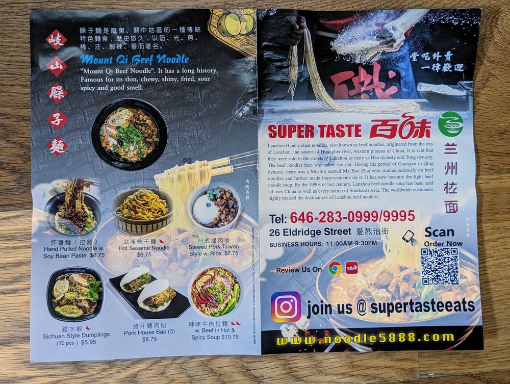 Super Taste, a small Chinese noodle spot located in New York's Chinatown, offers a range of delicious dishes with affordable prices. Customers rave about the crispy fried dumplings, pork buns, and hand-pulled noodles. The restaurant is known for its generous portion sizes and flavorful options, including vegan and vegetarian choices. Despite the limited seating, the quick service ensures that your order arrives promptly. The menu features a variety of options, from burning noodles with pork to spicy dumplings, catering to different preferences. With its budget-friendly prices and tasty offerings, Super Taste is a must-visit for those looking for authentic Chinese cuisine in a casual setting. Whether dining in or taking out, the flavors and quality of the food make it worth the visit.